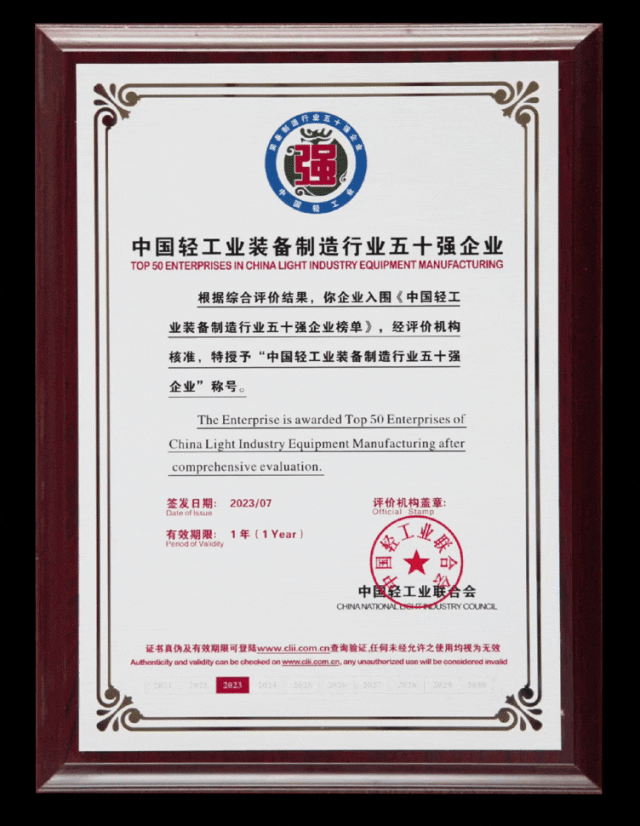 会上,中国轻工业联合会发布了2022年度轻工装备五十强企业评选结果,江苏海狮机械名列第15位。