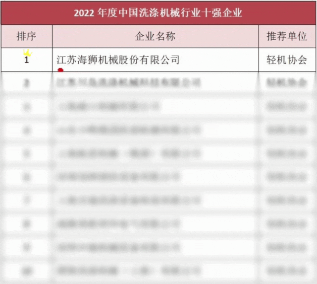 同时,由中国轻工机械协会推荐,荣获2022年度中国洗涤机械行业十强企业中,江苏海狮机械荣居榜首,继续领跑工业洗涤机械行业,展现出54年耕耘工业洗涤机械行业的深厚积淀和卓越成绩。