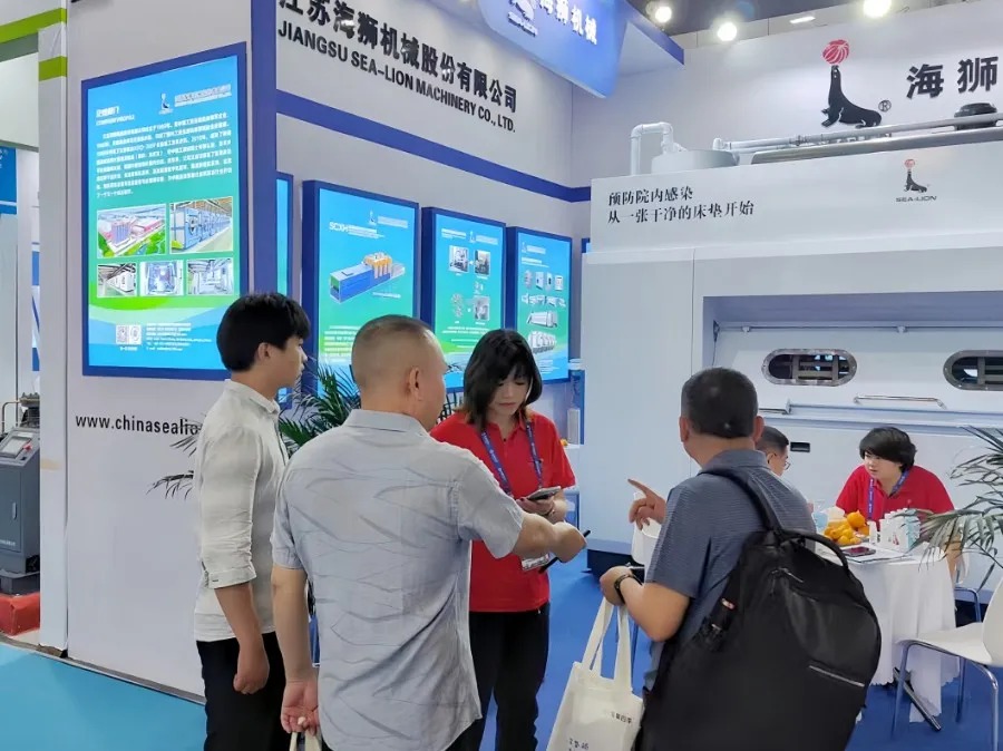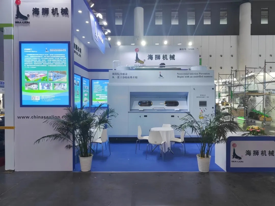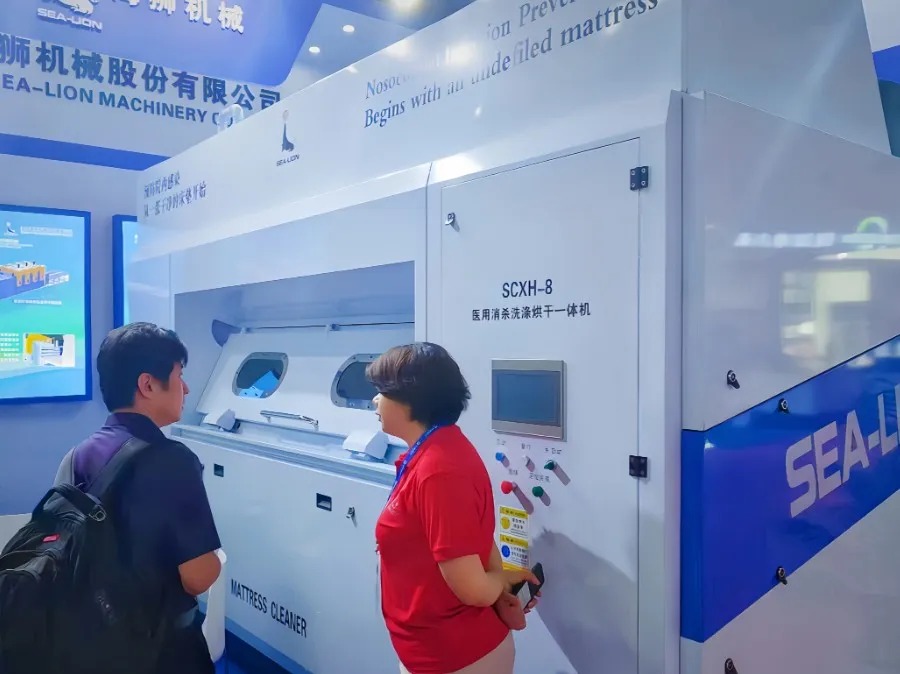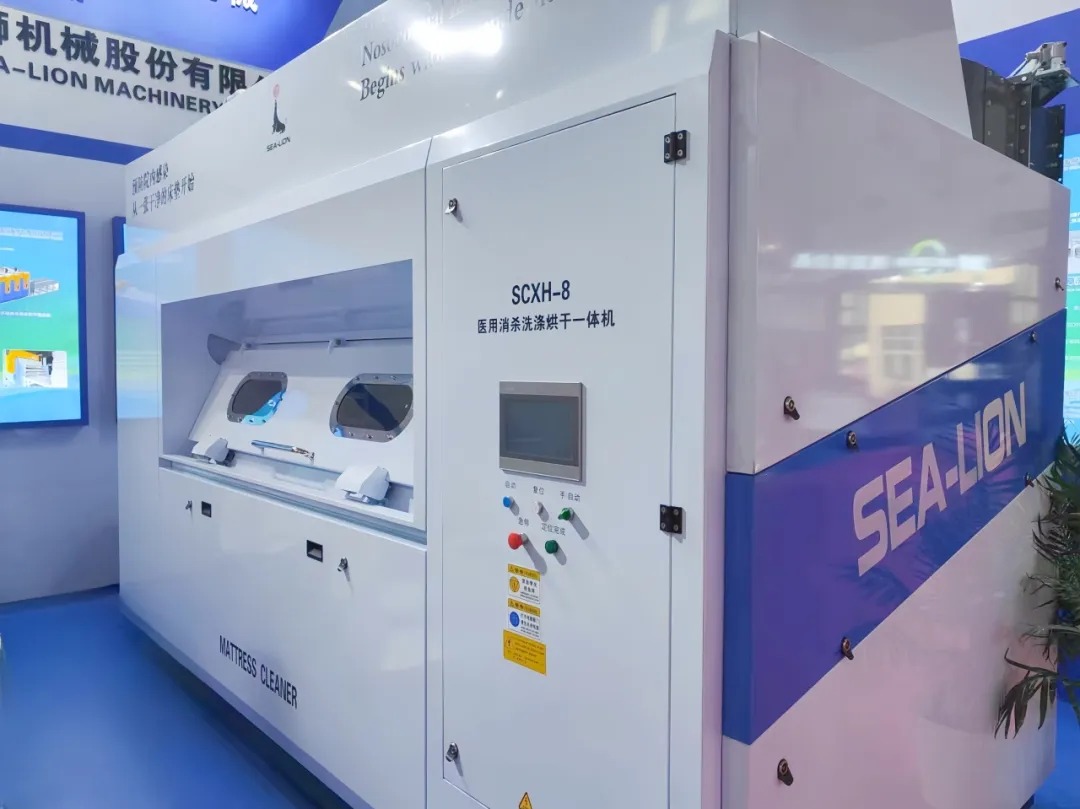 在本次展会上,海狮机械成为焦点。本公司拥有独家知识产权的海狮医用床垫一体机凭借独特设计和卓越性能,赢得了参会者的高度赞誉。这款产品在医用领域的独特之处在于,它能够解决医院病房床垫难以批量清洗消杀的世纪难题,解决了医用领域消杀全覆盖的“痛点和盲点”,有效预防了医院交叉感染风险。
