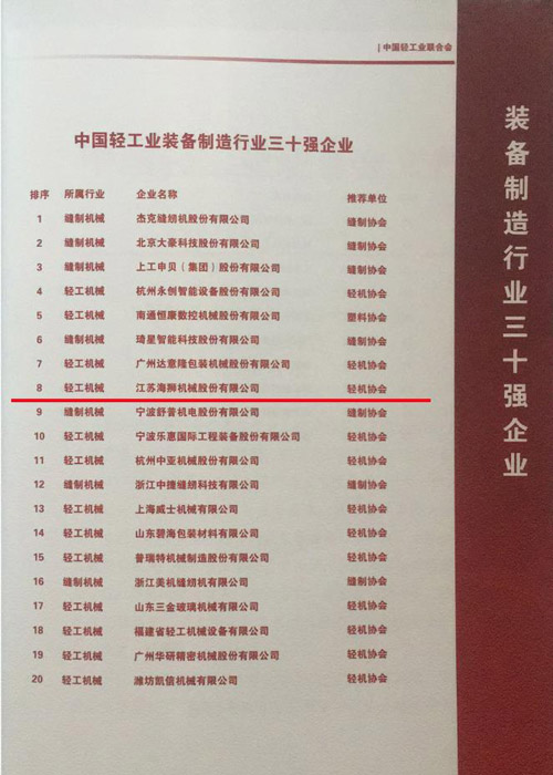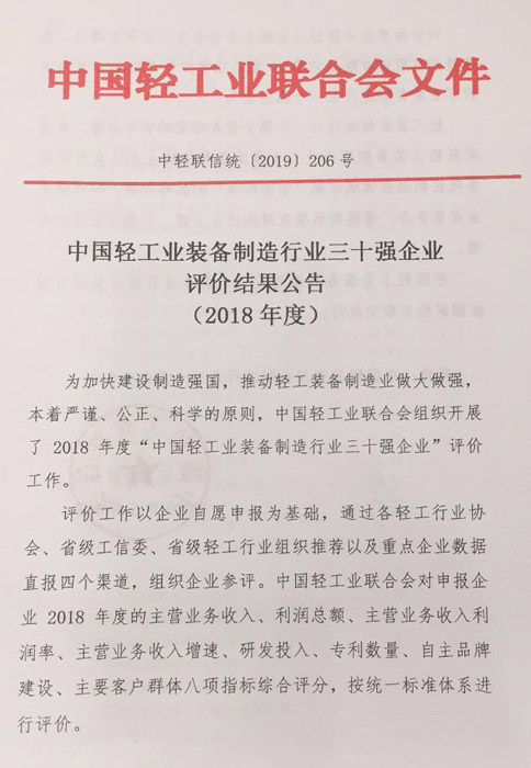 为加快建设强国,推动轻工装备制造业做大做强,本着严谨、公正、科学的原则,中国轻工业联合会组织开展了2018年度“中国轻工业装备制造行业三十强企业”、“中国轻工业科技百强企业”评价工作。